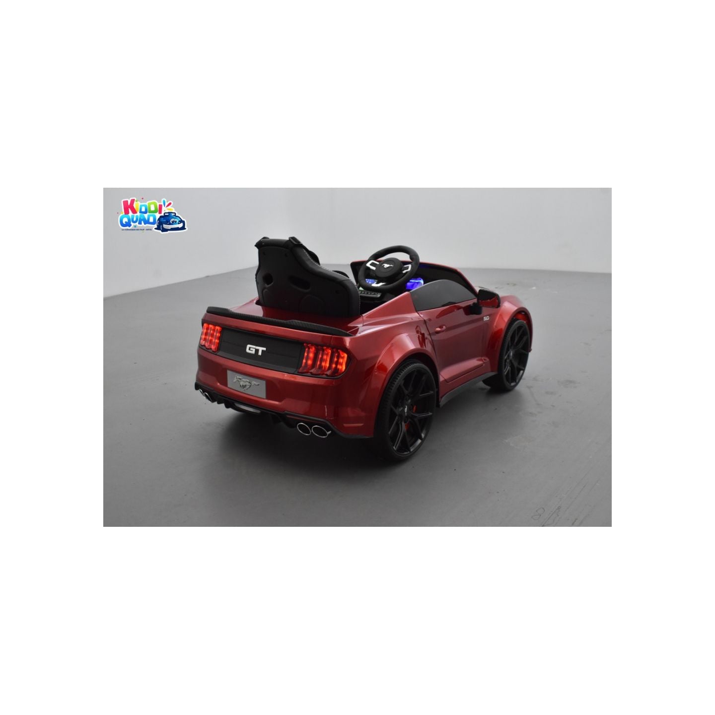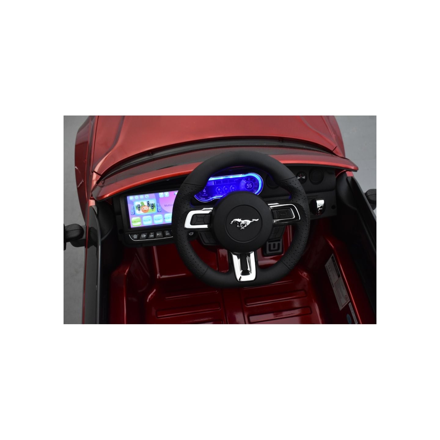 La tableau de bord de cette Mustang GT 24 Volts est équipé d'un écran LCD tactile de grande taille. Bébé Pilote peut écouter de la musique, jouer ses morceaux favoris et même regarder des dessins animés si l'envie lui prend. Le volant ergonomique de cette Mustang GT 24 Volts permet à bébé pilote une prise en main efficace dans toute condition. Le compteur est rétro éclairé pour encore plus de réalisme.